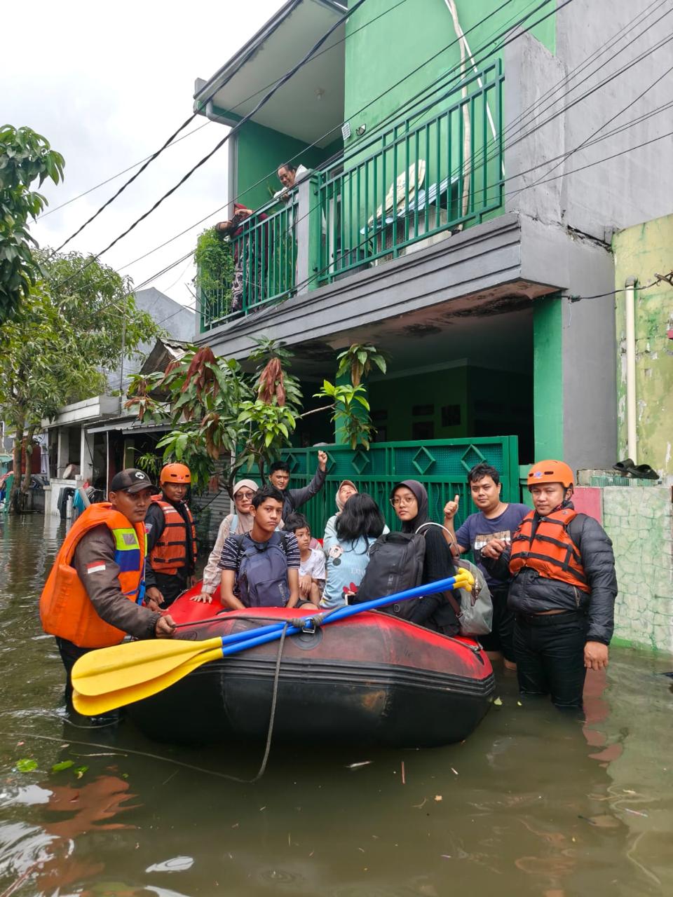 Meski menghadapi sejumlah kendala seperti kemacetan dan akses jalan yang tidak dapat dilalui kendaraan, tim tetap melakukan evakuasi dengan menggunakan perahu karet untuk menjangkau karyawan dan warga yang terisolasi akibat banjir.
